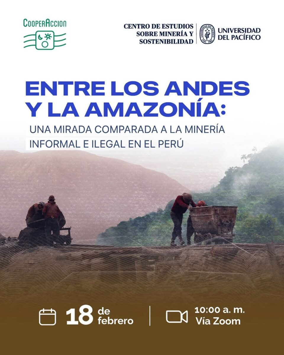 El Centro de Estudios sobre Minería y Sostenibilidad (CEMS) de la Universidad del Pacífico, en alianza con CooperAcción, realizó el webinar titulado “Entre los Andes y la Amazonía: Una mirada comparada a la minería informal e ilegal en el Perú”. El evento presentó los hallazgos de una investigación comparativa que analiza cómo se configuran y diferencian las dinámicas de la minería informal e ilegal en ambos territorios, así como sus impactos sociales, económicos y ambientales.