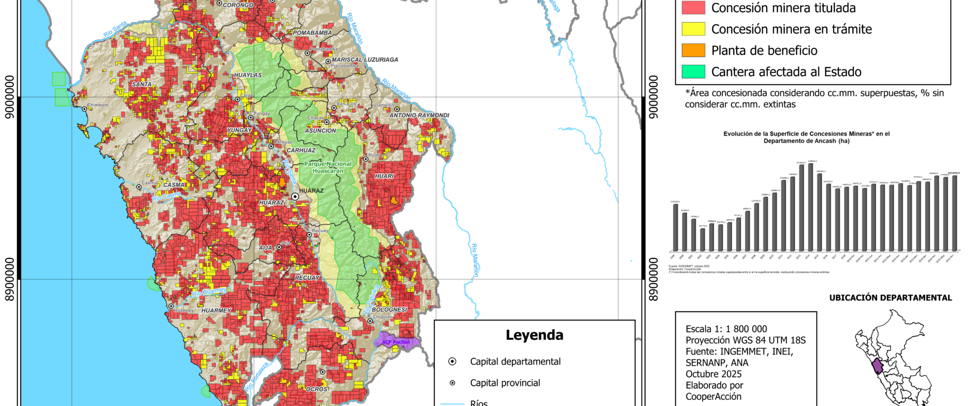 Mapa de concesiones mineras en el departamento de Ancash, al mes de abril del año 2025.