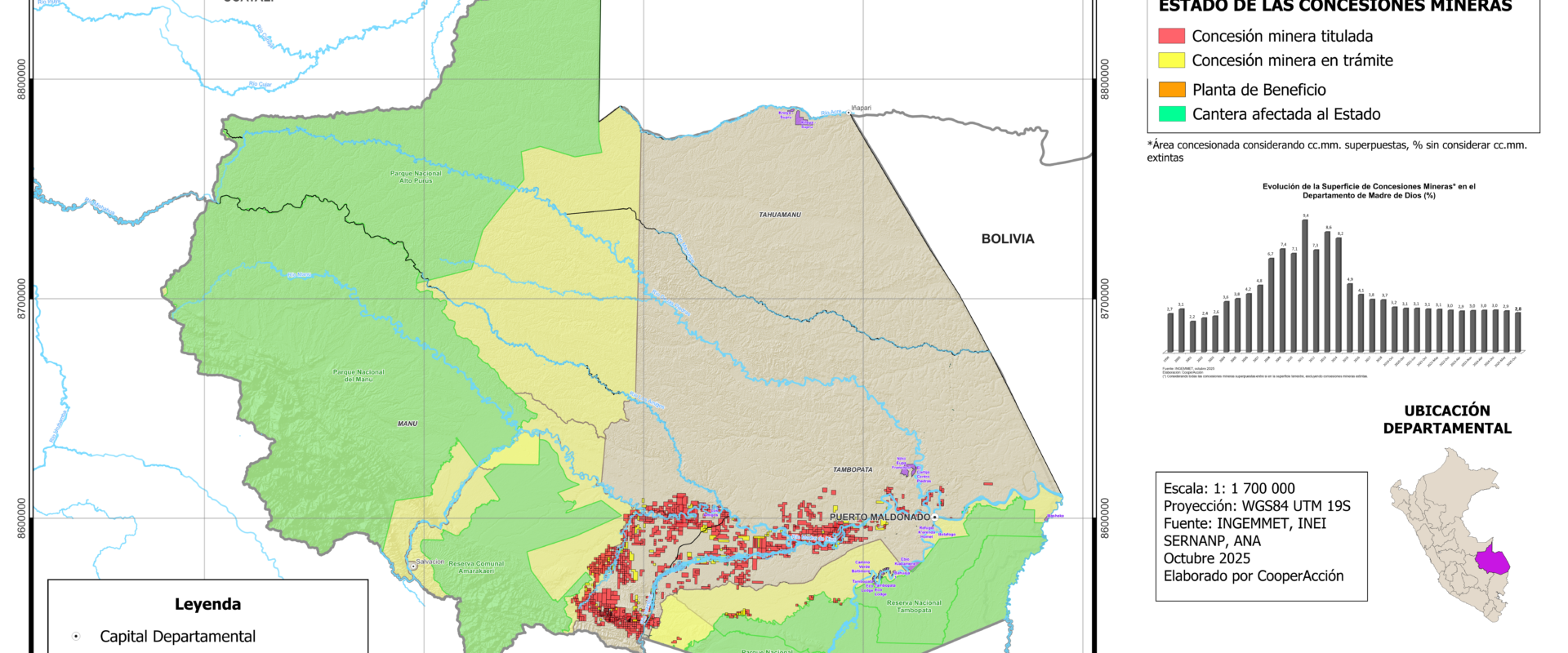 Mapa de concesiones mineras en el departamento de Madre de Dios, al mes de octubre del año 2025.