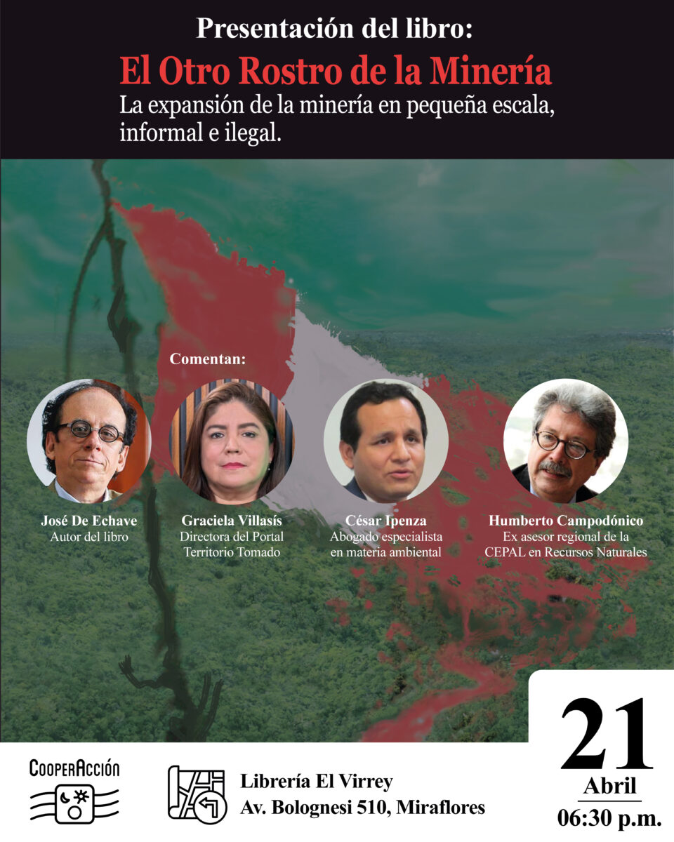 El próximo martes 21 de abril, a partir de las 6:30 p. m., se realizará la presentación del libro “El otro rostro de la minería en el Perú” en la Librería El Virrey. El evento es organizado por CooperAcción y tiene como objetivo abrir un espacio de reflexión y debate sobre la expansión de la minería en pequeña escala, informal e ilegal, una problemática que ha cobrado creciente relevancia en diversas regiones del país.